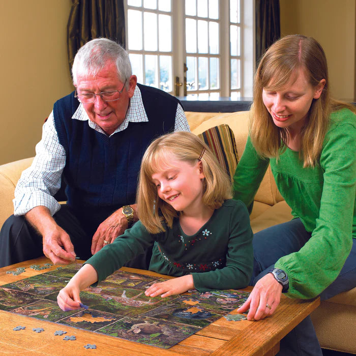 Family Pieces 350 puzzles include three different piece sizes so puzzlers of all skill levels can collaborate. The large pieces are on one end of the puzzle, the medium in the middle, and the small pieces on the other end. While these puzzles are designed for families, don't let that stop you from enjoying it on your own! It's also a great option for newer puzzlers who want to step up from a 275 piece puzzle, but not ready to jump into a 500 or 1000 piece. As well, skilled puzzlers enjoy this piece count when they need a little snack break.
