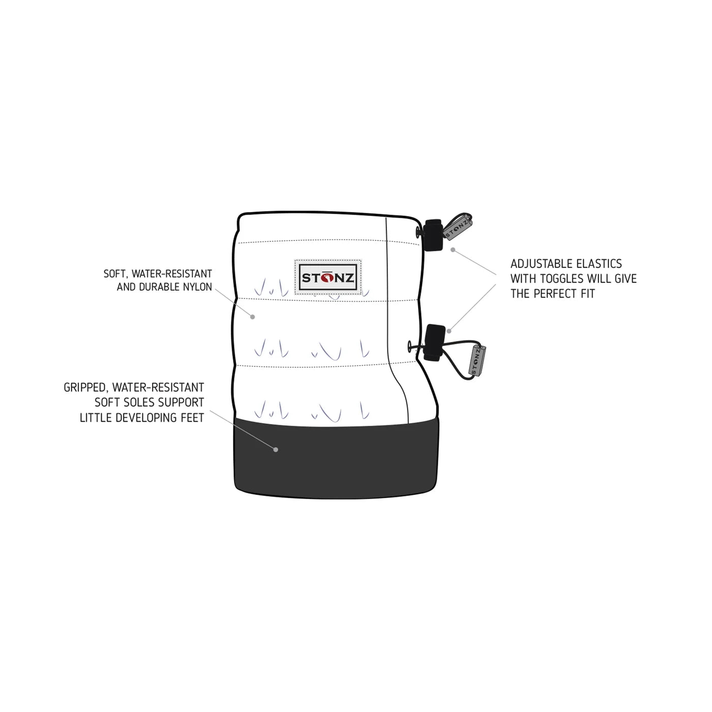 - Got a wiggly baby? Just secure with the toggle closure and you’re done: no amount of kicking and playing will get these off! Easy slip on shoes that stay on: Who has time to do laces?! These are on (and off) in seconds: just slip over baby’s feet, socks or shoes, adjust the toggles and off you go! They won’t be able to kick these off Adjustable toggle closure that grows with them: No need to have a bunch of new shoes every month