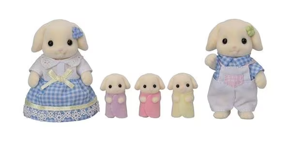 *The Flora Rabbit family members are wearing matching checkered outfits in a cool blue colour.
