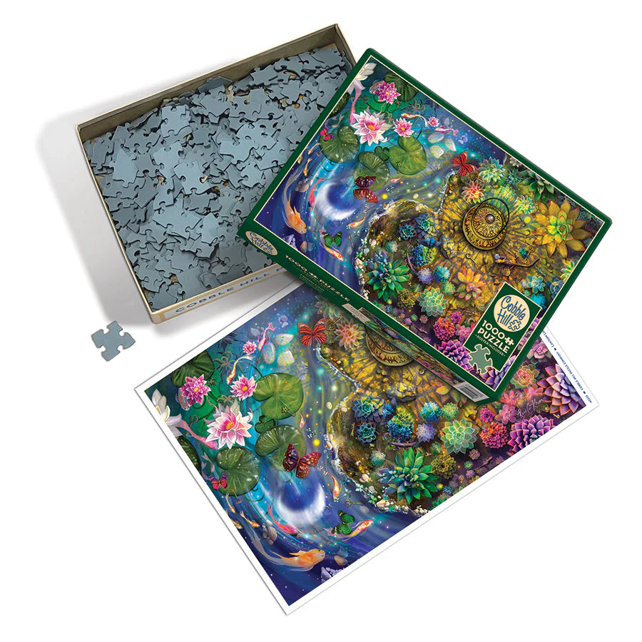 Butterflies dance above lotus flowers, rainbow-colored succulents bloom with otherworldly charm, and koi fish glide gracefully beneath the water’s surface. The left side of the puzzle features a winding waterway, while the right holds the mysterious island where the lantern shines bright.