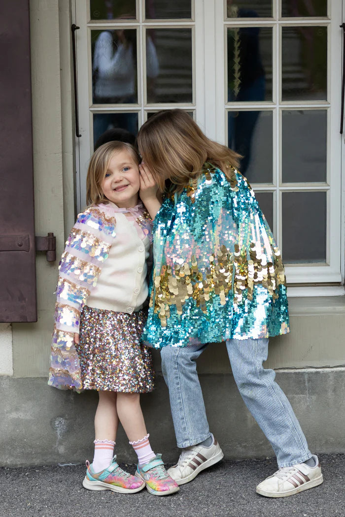 Add a touch of radiant elegance to any occasion with The 5th Avenue Pailette Cape, Gold/Light Pink. A cascade of shimmering gold sequins and oversized light pink paillettes form a stunning striped pattern down the cape, reflecting light with every movement. The alternating sequins create a soft, dazzling effect, while the gathered tulle collar adds a refined, fairy-tale finish. Whether for a magical costume, a special performance, or simply a dazzling day of play, this cape is designed to make your little one shine.