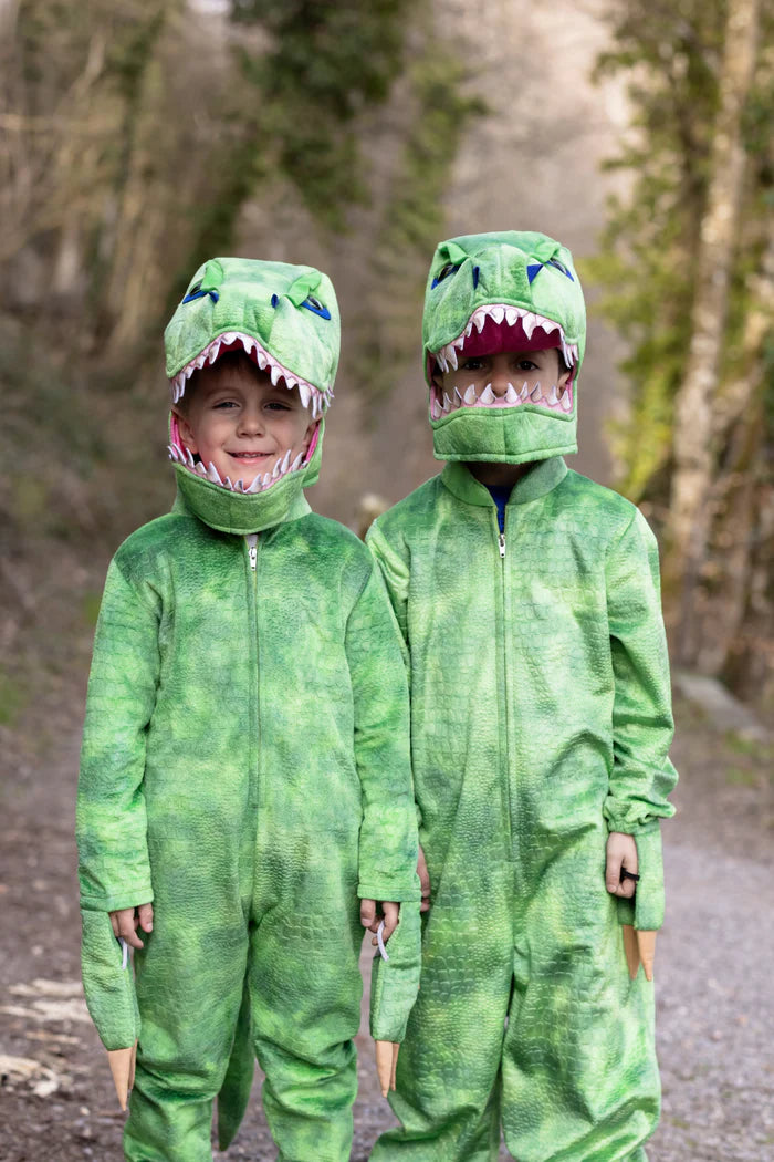 A dramatic tail cascades down the back, featuring bold metallic green spikes for extra stomp-worthy style. The plush T-Rex head fits comfortably over yours, with stuffed details like big eyes and ferocious teeth to bring your dino look to life.