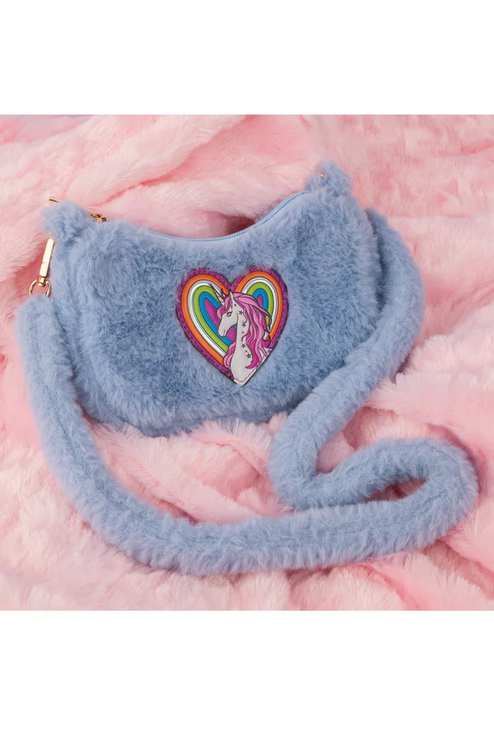 The soft periwinkle fur gives this purse a cozy, huggable feel, while the crossbody strap ensures hands-free convenience for all your adventures. Perfect for kids, this purse is both a charming accessory and a practical way to carry treasures.