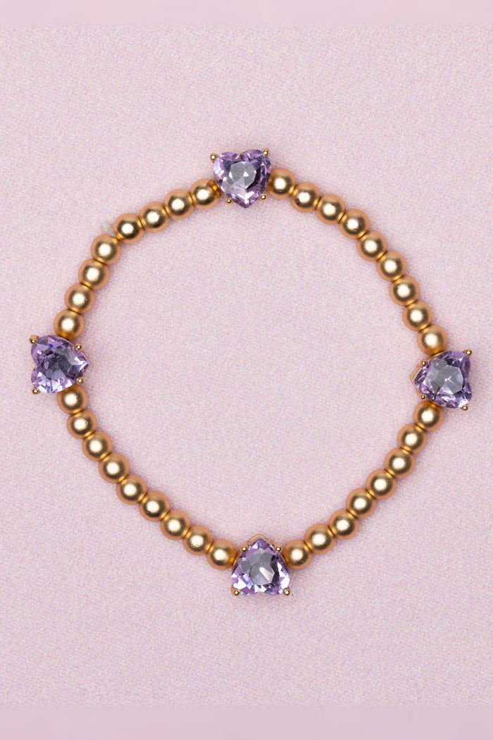 The Boutique Chic Amethyst Love Bracelet is a stylish accessory that will enhance your personal style. Its eye-catching design features gold beads and four beautiful lilac purple heart stones. The stretchy elastic design ensures a comfortable and secure fit for all wrist sizes, making it a versatile piece that is easy to wear.