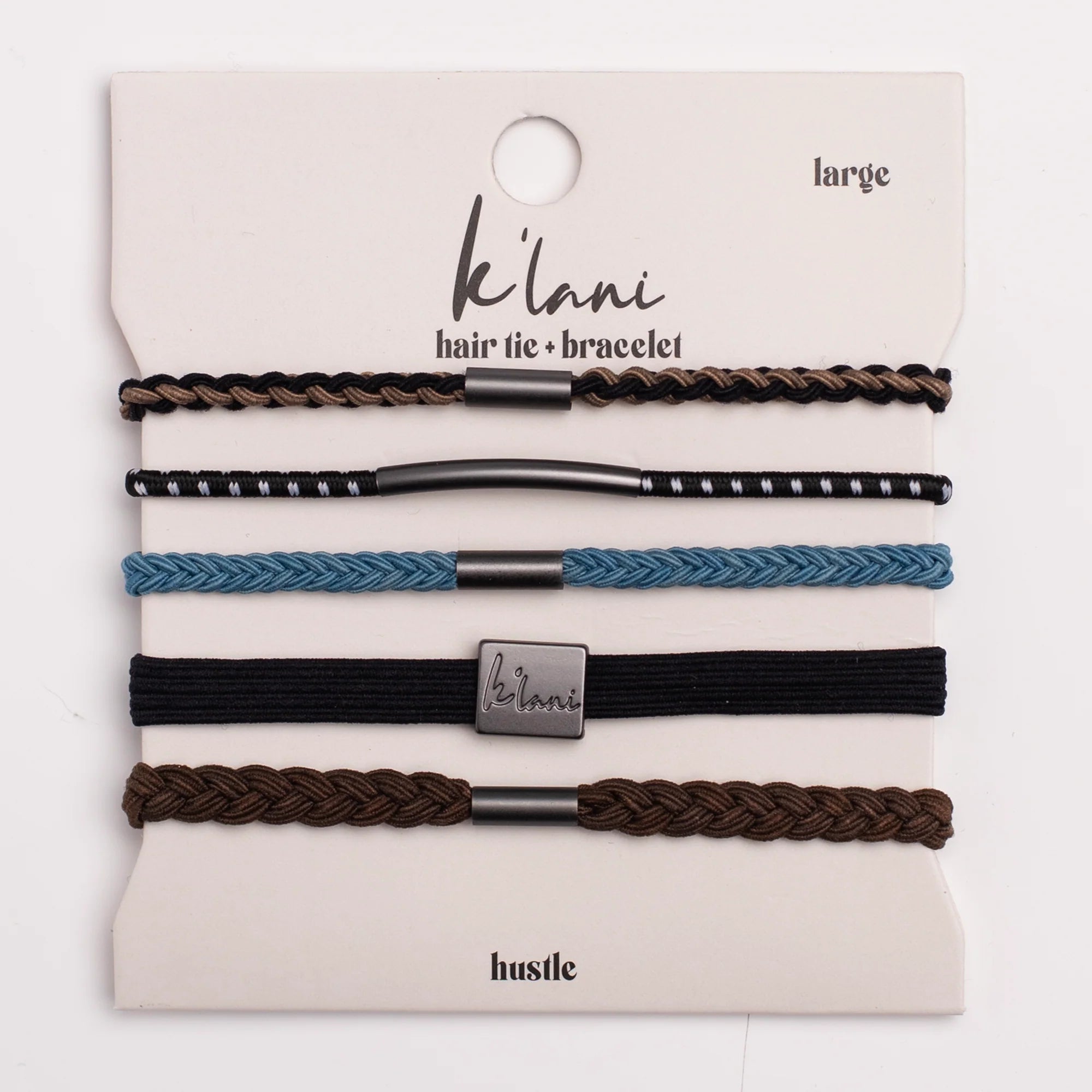 Our HUSTLE set includes five hair tie bracelets in strong colors of black, brown, and blue with matte black details. This set is perfect for guys and girls and will make all who wear it bring a little more hustle to their game.