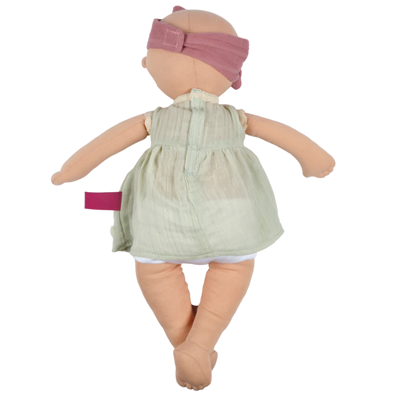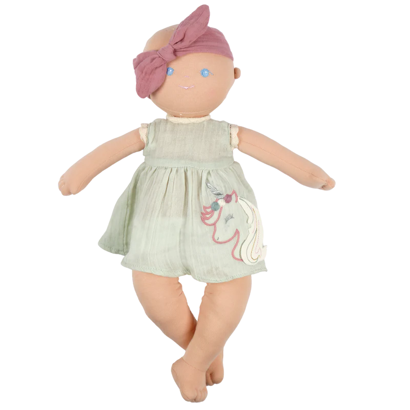 Kaia is a bestselling organic baby soft doll, dressed in a dusty blue embroidered dress with lace details and a dusky pink bandana. Handmade with a soft, huggable body, she's ideal as a soothing companion or comforting empathy doll. Her removable dress, nappy, and headband make her perfect for imaginative play and gentle snuggles.