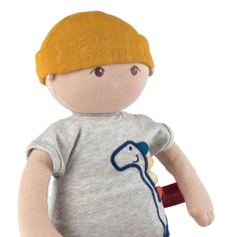 Kye is a bestselling organic baby soft doll, dressed in a grey onesie with dinosaur embroidery and a mustard yellow hat. Handmade with a soft, huggable body made from OCS 100% certified organic cotton, he's perfect as a soothing companion or comforting empathy doll. Filled with recycled polyester, Kye is gentle, safe, and ideal for cuddles and imaginative play.