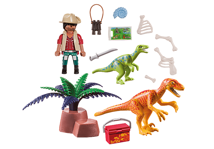 Figures: 1 explorer; Animals: 2 velociraptors; Accessories: 1 dino explorer carry case, 3 bones, 1 shell, 1 ride, 1 box with lid, 1 binoculars, 1 map