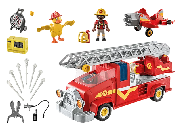 Figures: 1 Ducklas, 1 Freddy Fire; Accessories: 1 fire truck with light and sound module as well as turntable ladder, hose reel, fan and power unit, 1 mini-airplane with extinguishing cannon, 7 foam arrows, 1 rescue shears, 1 radio, 1 fire extinguisher with back stretcher plus jet tube