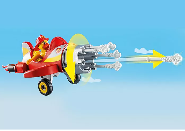 Help, there's a fire in Playmoville! To fight the big fire, Freddy arrives immediately with his fire rescue truck. Ducklas supports him from the air and extinguishes the flames with the large water cannon of his mini-plane. To get a better view of the scene from above, Freddy uses the practical ladder, which can be set up and swung out. In the large storage compartment of the fire truck, he can easily stow the equipment for all missions. So any fire can be put out! The set features the PLAYMOBIL D*O*C* heroes Ducklas and Freddy Fire, a large fire rescue truck with extendable and swiveling ladder and a detachable mini airplane with water cannon.