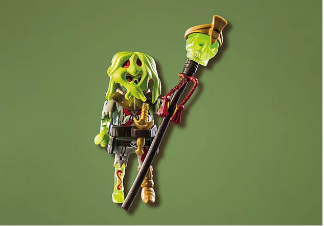 Figures: 3x skeleton; Accessories: 1 vehicle, 8 bolt bullets, 4 slime patches, 2 chains, 2 axes, 1 cauldron, 1 cauldron holder, 1 barrel with lid, 1 seat, 4 jaw parts, 1 mammoth skeleton head, 2 tusks, 2 head scarves, 2 daggers, 2 sabers, 4 arm rings, 2 shields, 4 holders for daggers and shield, 1 slime mask, 1 map, 1 spoon, 1 container, 1 staff with decorative cord, 1 crown, 1 skeleton head, 1 strap, 3 textile scrapsRecommended for ages 5 and up.