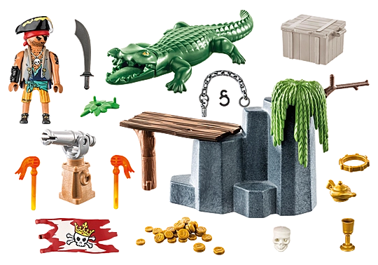 Figures: 1 pirate; Animals: 1 alligator; Accessories: 1 rock with footbridge, chain and plant, 1 cannon, 2 projectiles, 1 flag, 1 chest with coins, 1 golden cup, 1 golden jug, 1 crown, 1 pirate hat, 1 skull, 1 sabre