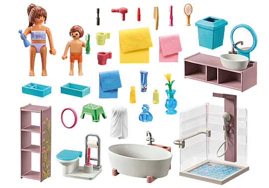 Figures: 1x woman, 1x boy; Accessories: 1x freestanding bathtub, 1x washstand with washbasin, mirror and storage space, 1x high shelf, 1x WC with toilet brush, 1x shower, various care products, 2x shelf baskets and towels, 1x children's stool, 1x laundry basket, 1x flower in vase