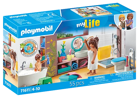 The modern bathroom is a true wellness paradise, featuring a freestanding bathtub, shower cabin, sink, and numerous bathroom accessories. For the individual expansion of the new residential house with conservatory. Perfectly combinable with other Living House sets from PLAYMOBIL. Sustainable fun: On average, all PLAYMOBIL My Life Living House playsets consist of over 80% recycled and bio-based materials.