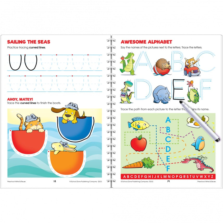 Encourage, inspire, and motivate preschoolers to try until they succeed! Introduce kids to pre-writing skills, the alphabet, numbers, colors, shapes, and more with a fun, easy way to practice! With this Preschool Write & Reuse Workbook kids can write, wipe away, and redo the activities in the book over and over again. Follow the directional arrows to follow pathways and also make uppercase and lowercase letters.