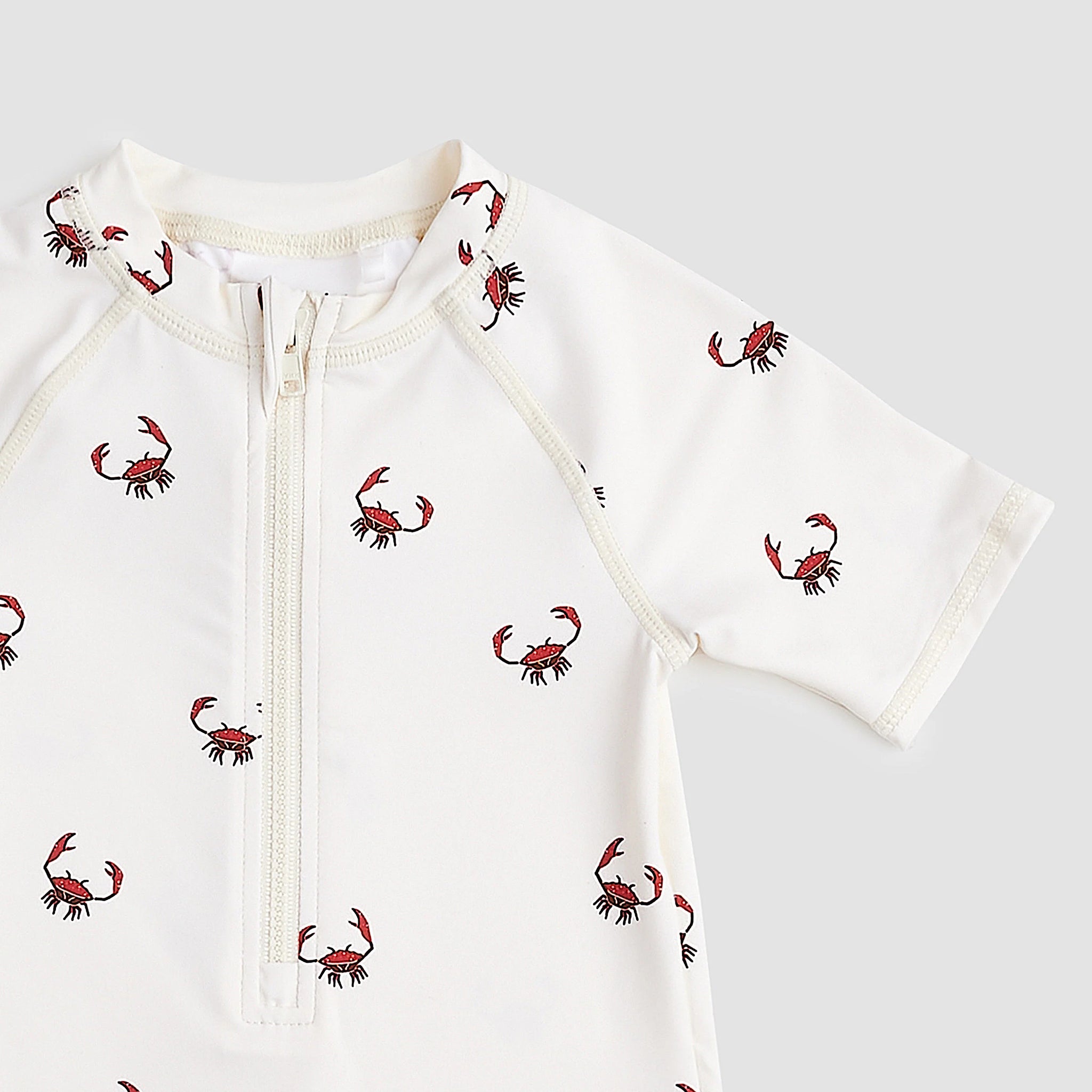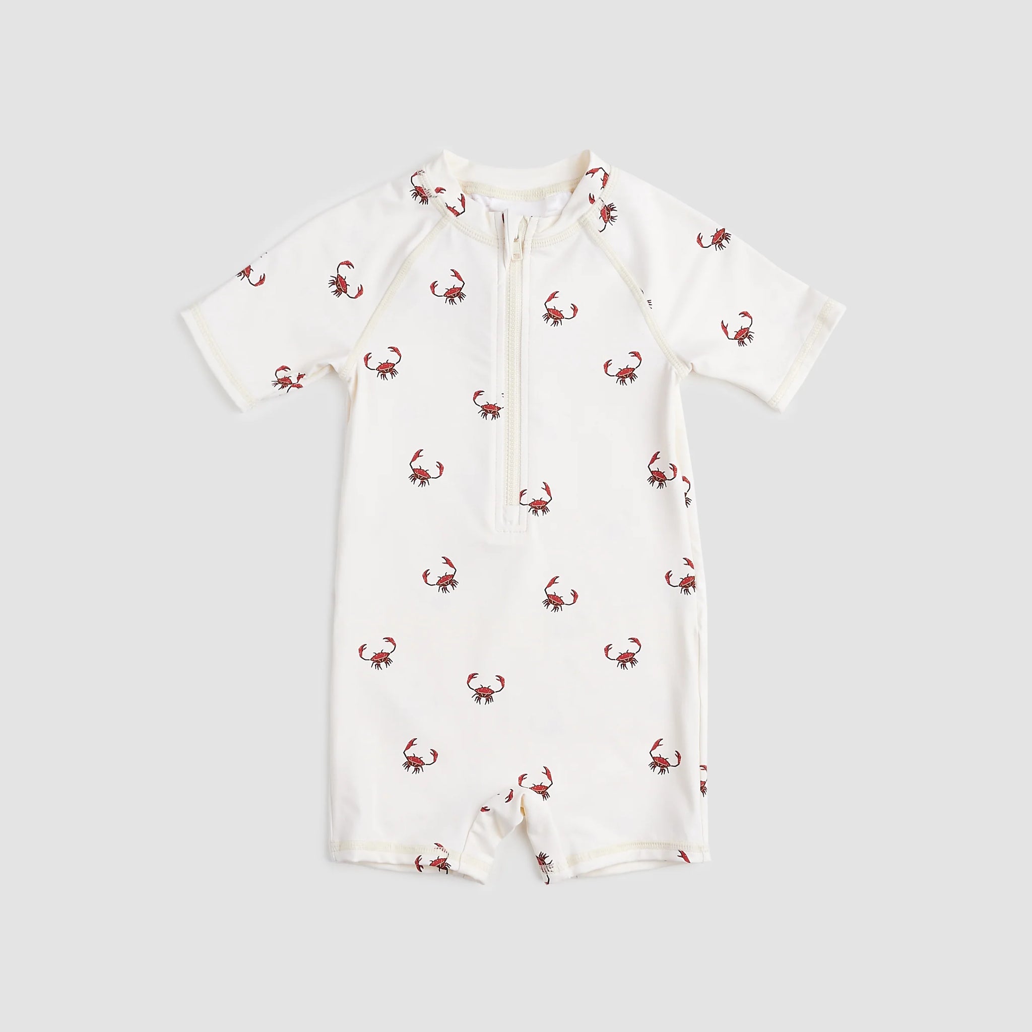 Keep them comfortable while they splash and play in this fun, short sleeved swim romper. Made from recycled nylon, the romper has a tight fit that provides a barrier against salty waters and chilly waves. The zip down the front makes the one piece easy to remove even when wet and the piece has built-in UPF50+ to protect them from the sun’s strong rays.