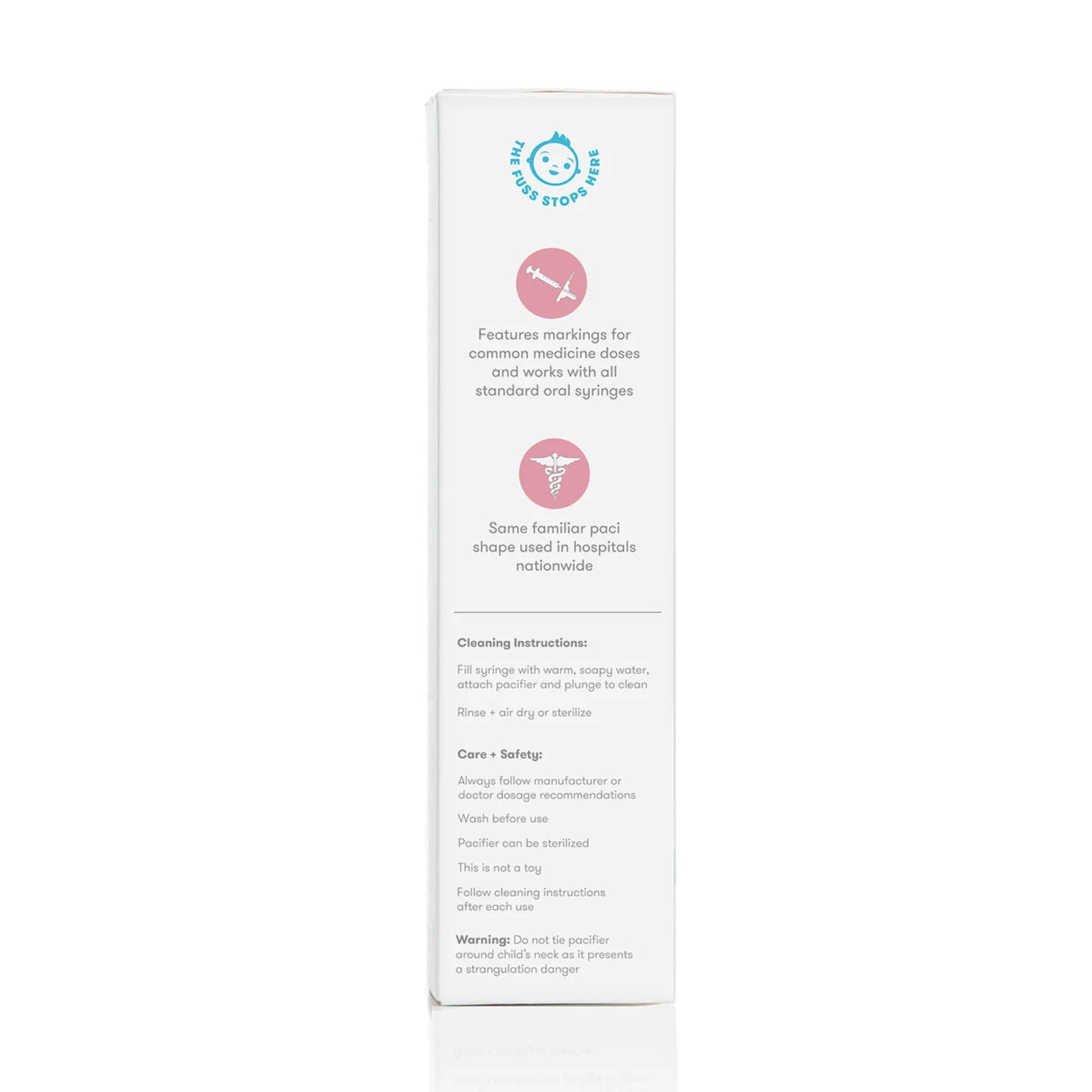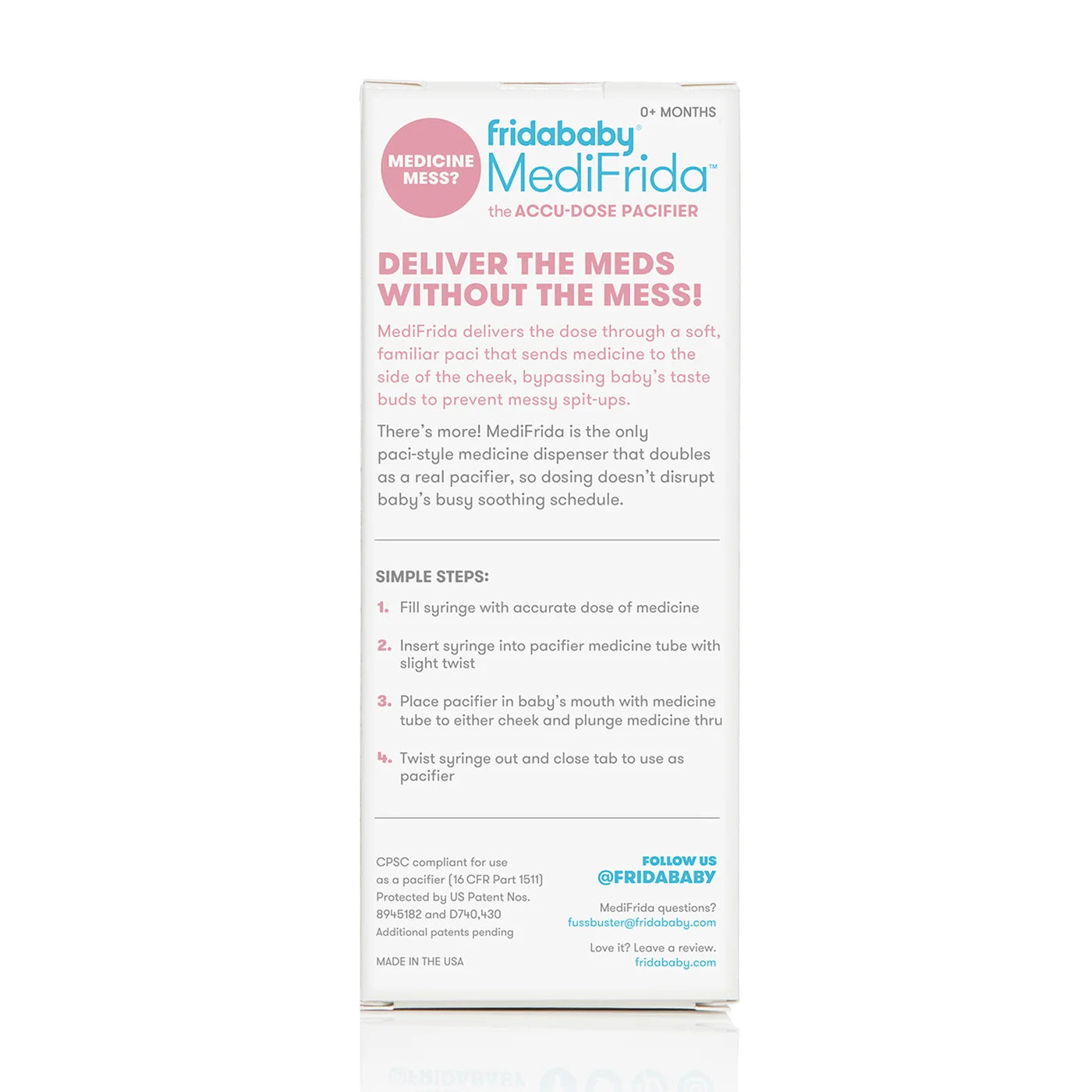 What's Inside: 1 MediFrida Medicine dispenser + pacifier, 1 standard oral medical syringe