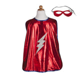 Save the day and be your own superhero with this amazing cape-tutu set with matching mask. The lighting bright red tutu featuring a silver star pattern and is trimmed in blue sequins. The matching cape is bound in blue shine and features a matching lighting bolt to the soft, easy-on-and-off, superhero mask.
