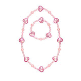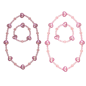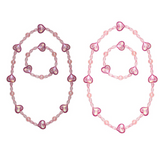 This cotton candy necklace bracelet set will NOT break your heart. Sweet as cotton candy, these necklaces come in light pink in tones and feature detailed heart beads strung together with small pink clear beads on a stretchy durable elastic cord.