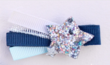 This navy unicorn & star hair clip is perfect for little ones! The clip features one glittery unicorn OR one shooting star. The clips are secured to the hair with a ribbon-covered alligator clip that won't snag or pull hair.