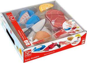 Protein is important for building muscles. Practice preparing foods like beef, chicken, fish and bacon with this realistic kitchen playset. Includes play knife and lemon wedge.