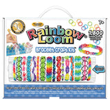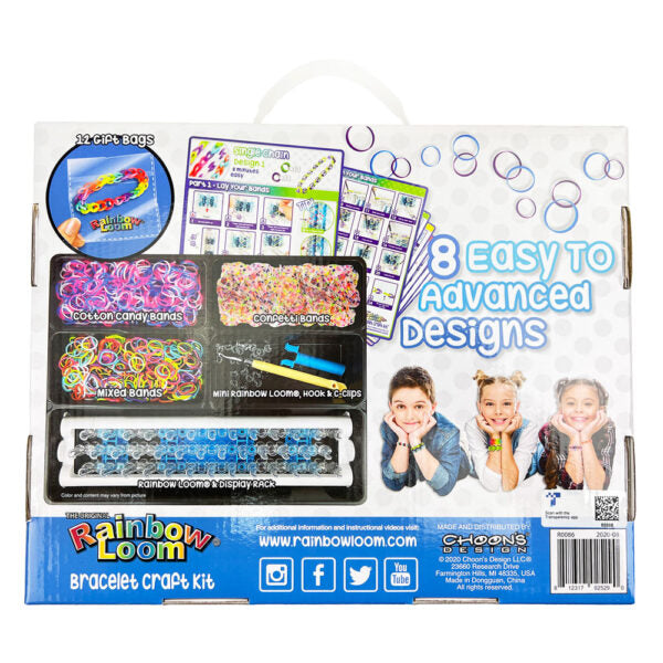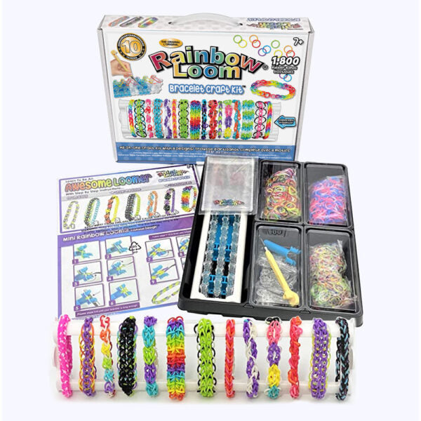 All-in-one bracelet kit includes 1 Original Rainbow Loom, 1 Mini Rainbow Loom, 1800 assorted Rubber (600 Assorted Color Bands, 600 Cotton Candy Bands, and 600 Confetti Mix Bands), 1 Metal Hook, 75 C-Clips, Display Rack, and 8 double-sided design instruction manuals.