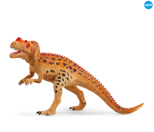 The Ceratosaurus from Schleich® DINOSAURS has three prominent bumps on its head. Blade-shaped teeth line its movable jaw.