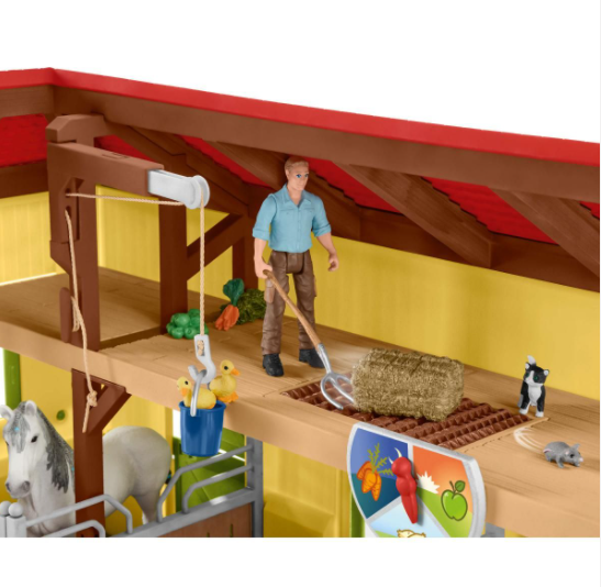 The new colourful horse stable offers lots of fun features and provides endless fun for little ones! With 7 cute animals, 2 horse boxes, farmers Paul and Laura and, of course, lots of accessories, it is easy to reproduce all the daily work on the farm. While the farmer's wife prepares to go for a ride, farmer Paul uses the hoist to transport new feed to the hayloft. It is always easy for him to transport the hay bales to the feed chute thanks to the moving transport rollers that help them fall easily into the wheelbarrow. The feed indicator can be gradually adjusted according to the amount of feed the animals need. Has the farmer discovered the cute mouse sitting in his mouse hole? Children can use the sticker to personalise the horse stable however they wish.