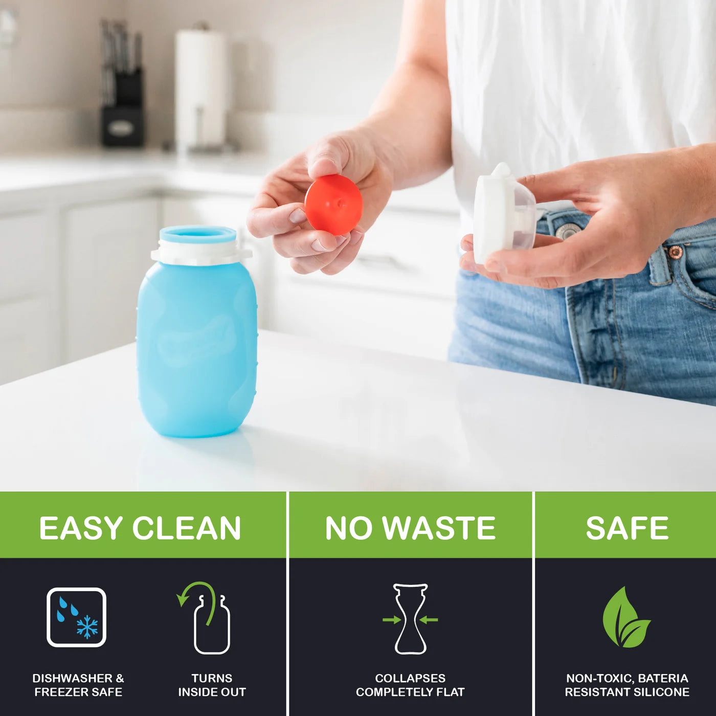 The Squeasy Snacker™ is the most versatile reusable food pouch on the market. It was designed by parents for parents to provide easy feeding on-the-go™. It is the only food pouch that offers the patent pending 2-in-1 removable NO SPILL INSERT™ for no spill or free flow. It not only works great for purees, smoothies, applesauce, yogurt, pudding, etc., but it also prevents spills when serving water and juice unlike other food pouches. Easy to fill: Features a wide opening. The collar and spout are easy to grip for opening and closing. Easy to use: Simply fill with delicious blends of freshly pureed food, applesauce, yogurt, water or juice, etc. asy to clean: The bottle can be turned inside out and all parts are top rack dishwasher safe.